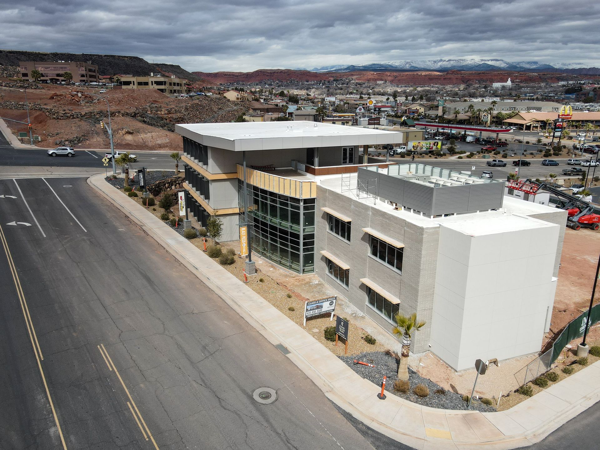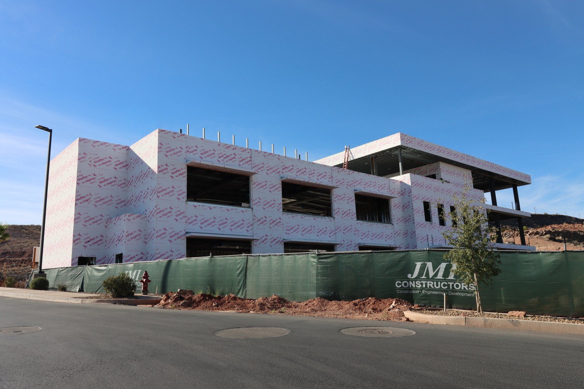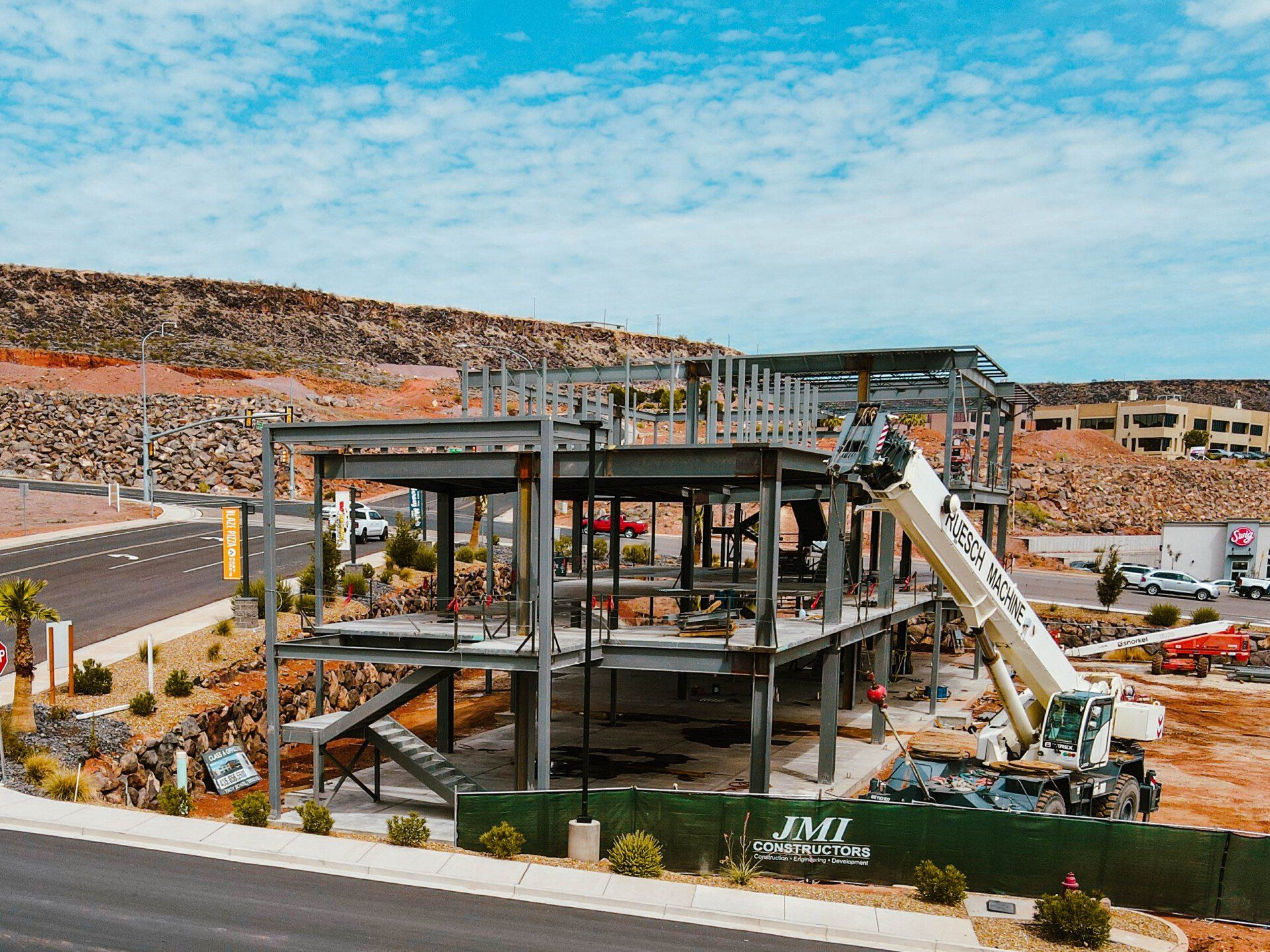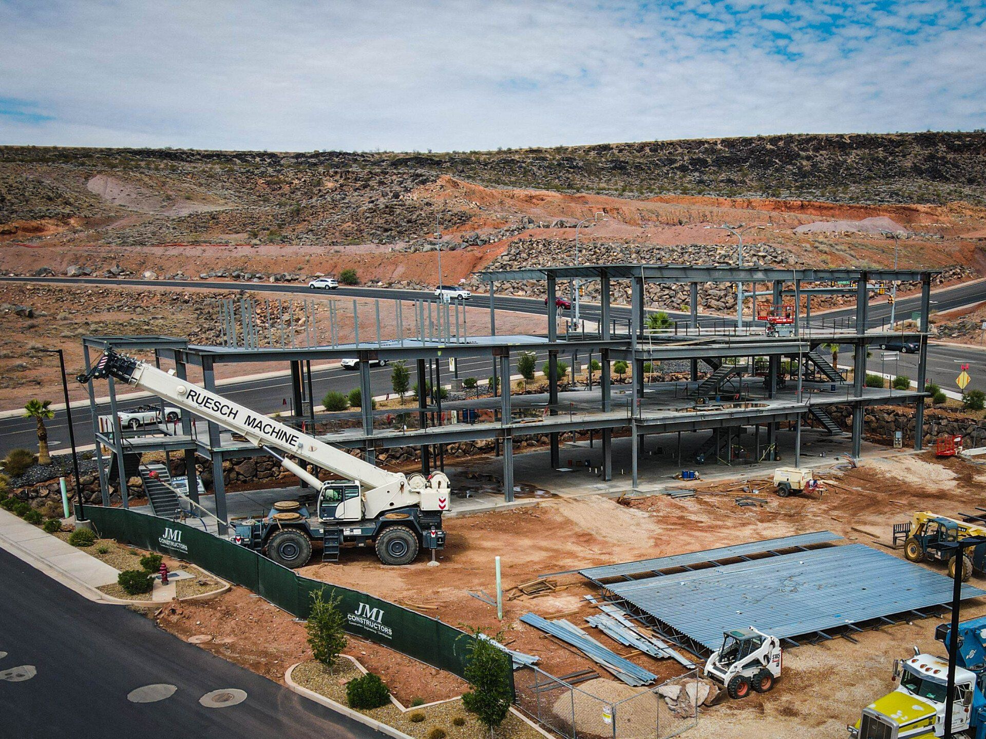 One of the three new buildings at Commerce Pointe, building 100 is the largest building on this property that we've built this year (2022). It consists of steel column framing and is four stories high! It will be home to many separate businesses, such as another local Bank of Utah, which has been adding locations throughout Southern Utah in recent years, and law firm, and many other businesses and offices. JMI Property Services is currently in the process of leasing these future business suites. This building is massive, and so it will be completed well after the other two that we've built this year, namely, Swig and Beans & Brews across the street. If you are interested in leasing office space clickHEREfor more information.