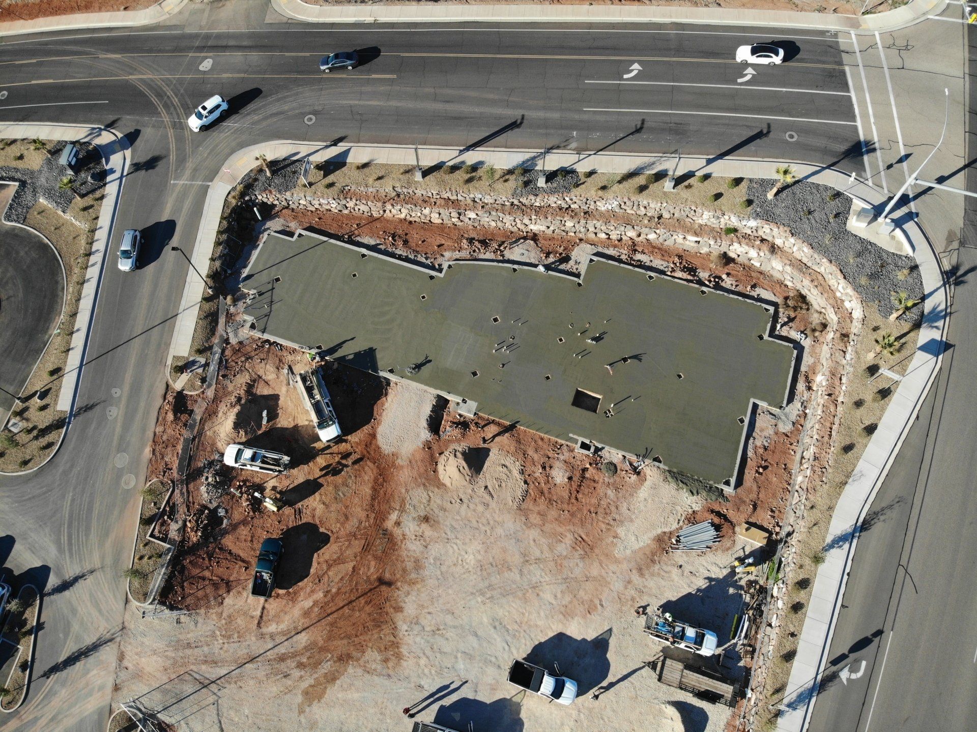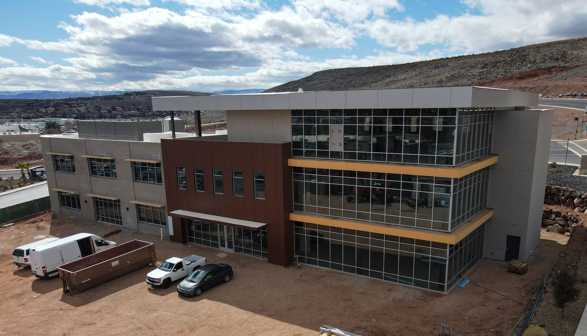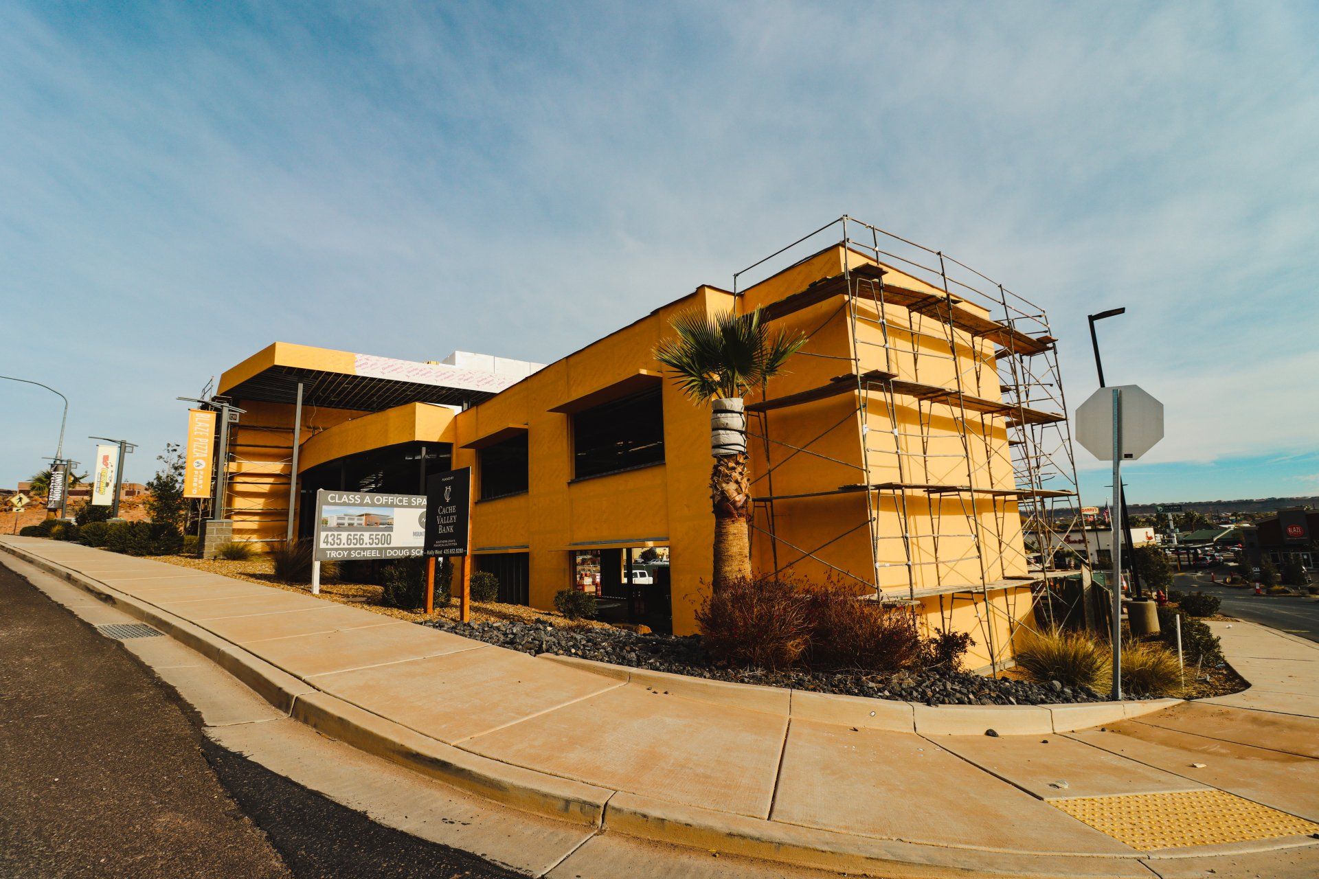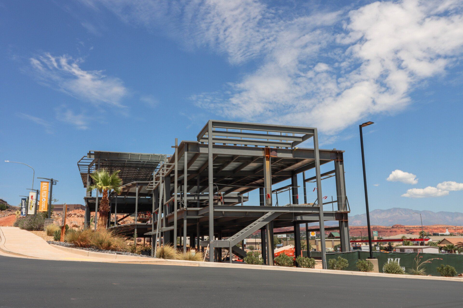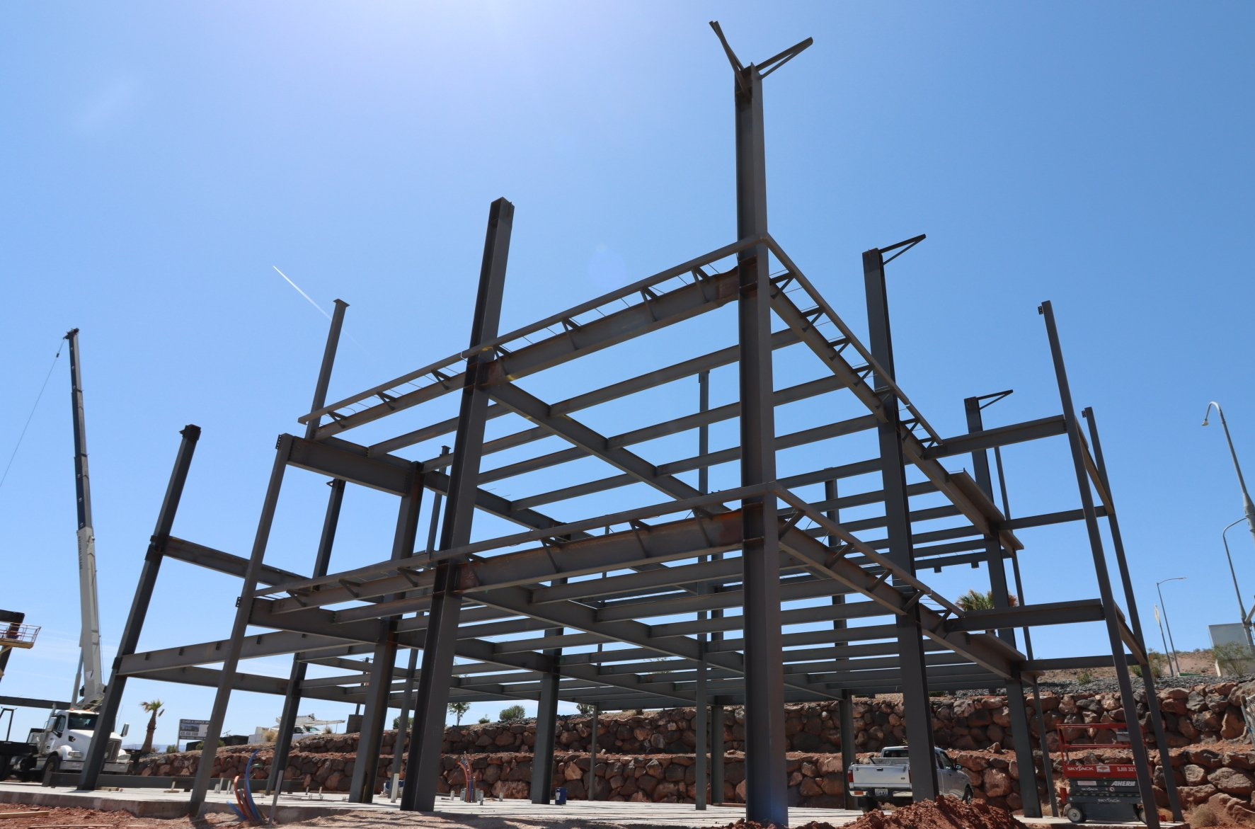 One of the three new buildings at Commerce Pointe, building 100 is the largest building on this property that we've built this year (2022). It consists of steel column framing and is four stories high! It will be home to many separate businesses, such as another local Bank of Utah, which has been adding locations throughout Southern Utah in recent years, and law firm, and many other businesses and offices. JMI Property Services is currently in the process of leasing these future business suites. This building is massive, and so it will be completed well after the other two that we've built this year, namely, Swig and Beans & Brews across the street. If you are interested in leasing office space clickHEREfor more information.